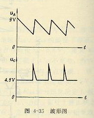 在圖4-34所示的電路中,當(dāng)輸入電壓u3為0時(shí),雙三極管BG15的右半部三極管在電阻R45、R46的偏置下導(dǎo)通,導(dǎo)通電流Ie2在R42上的壓降使B點(diǎn)電位為-0.6V,使左半部三極管剛好處于截止?fàn)顟B(tài)。因?yàn)樗刂梗珻19不充電,所以A點(diǎn)電位為+9V,BG17的射極通過(guò)R44與A點(diǎn)相接。由于R44很小,只有47Ω,所以BG17的射極電位也是+9V,而它的基極電位是+405V(由R48,R49的分壓比決定),基極電位低于發(fā)射極電位,因此BG17、BG16都處于截止?fàn)顟B(tài)。當(dāng)有直流正電壓輸入時(shí),BG15左半部的三極管開(kāi)始導(dǎo)通。它的集電極電流Ic1對(duì)C19充電,使A點(diǎn)電位逐漸下降。當(dāng)電位降到3.8V時(shí),BG17的射極電位比基極電位低0.7V,這時(shí)BG17就開(kāi)始導(dǎo)通,它的集電極電流提供給BG16作為基極電流,使BG16也導(dǎo)通,它的發(fā)射極電流流過(guò)R49,在R49上產(chǎn)生電壓降,使C點(diǎn)電位上升,促使BG17進(jìn)一步導(dǎo)通。這是一個(gè)很強(qiáng)的正反饋過(guò)程,在很短的時(shí)間內(nèi)就使BG17、BG16處于飽和導(dǎo)通狀態(tài),BG16的集射極間呈短路狀態(tài),C點(diǎn)電位就由+4.5V跳變到+9V。與此同時(shí),C19上的電荷通過(guò)R44、BG17、BG16放電。在放電過(guò)程中,A點(diǎn)電位隨之上升。當(dāng)它升至大于8.3V后,BG17的基射極間的電壓就小于0.7V,使BG17退出飽和導(dǎo)通狀態(tài),轉(zhuǎn)向截止。這一過(guò)程是上面的逆過(guò)程,強(qiáng)烈的正反饋使BG17、BG16迅速截止,C點(diǎn)電位恢復(fù)到原來(lái)的4.5V,C19又重新開(kāi)始充電。重復(fù)上述過(guò)程就形成一連串的脈沖輸出。其波形如圖4-35所示。